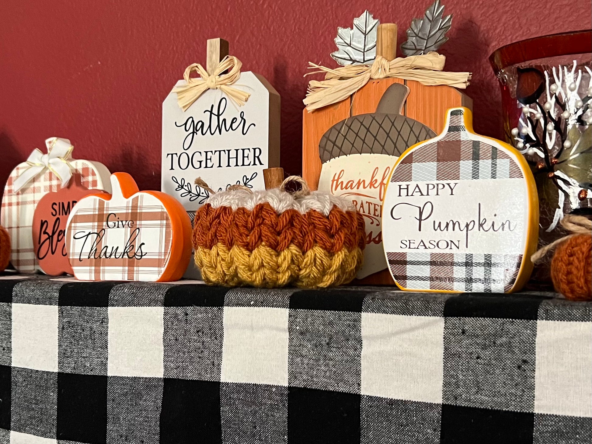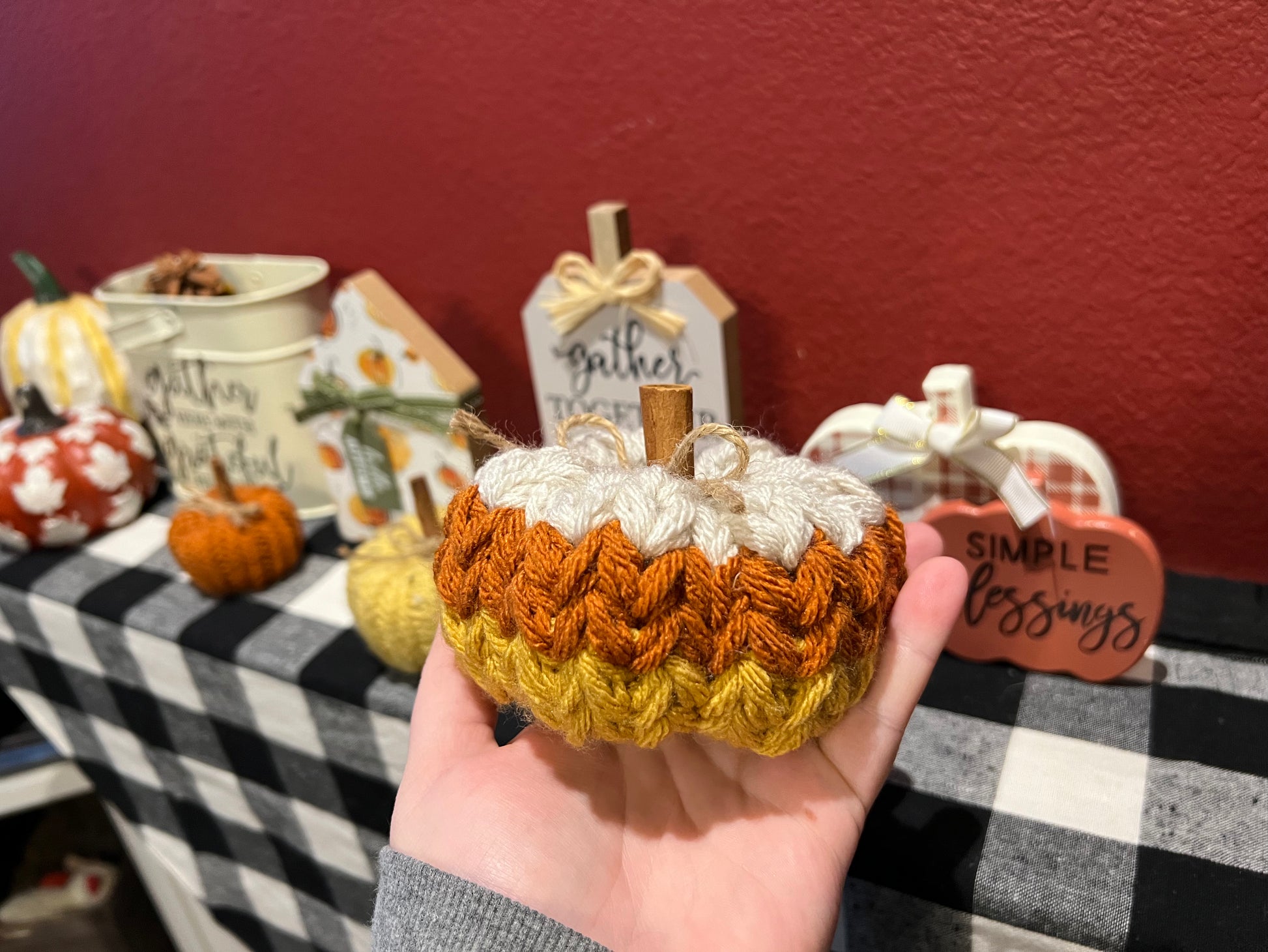 Made with acrylic yarn, poly-fil stuffing, a real cinnamon stick attached using hot glue, and some jute string used to make a bow- this pumpkin is sure to add some Fall joy to your home or wherever you decide to decorate!