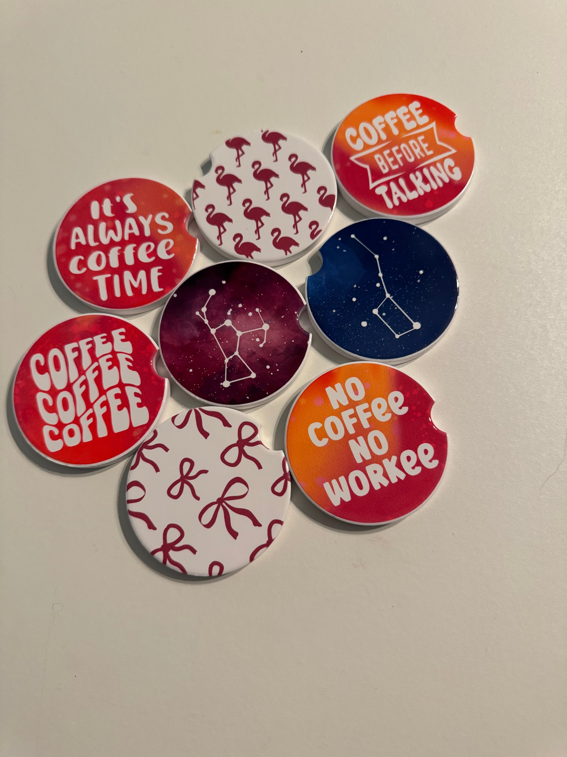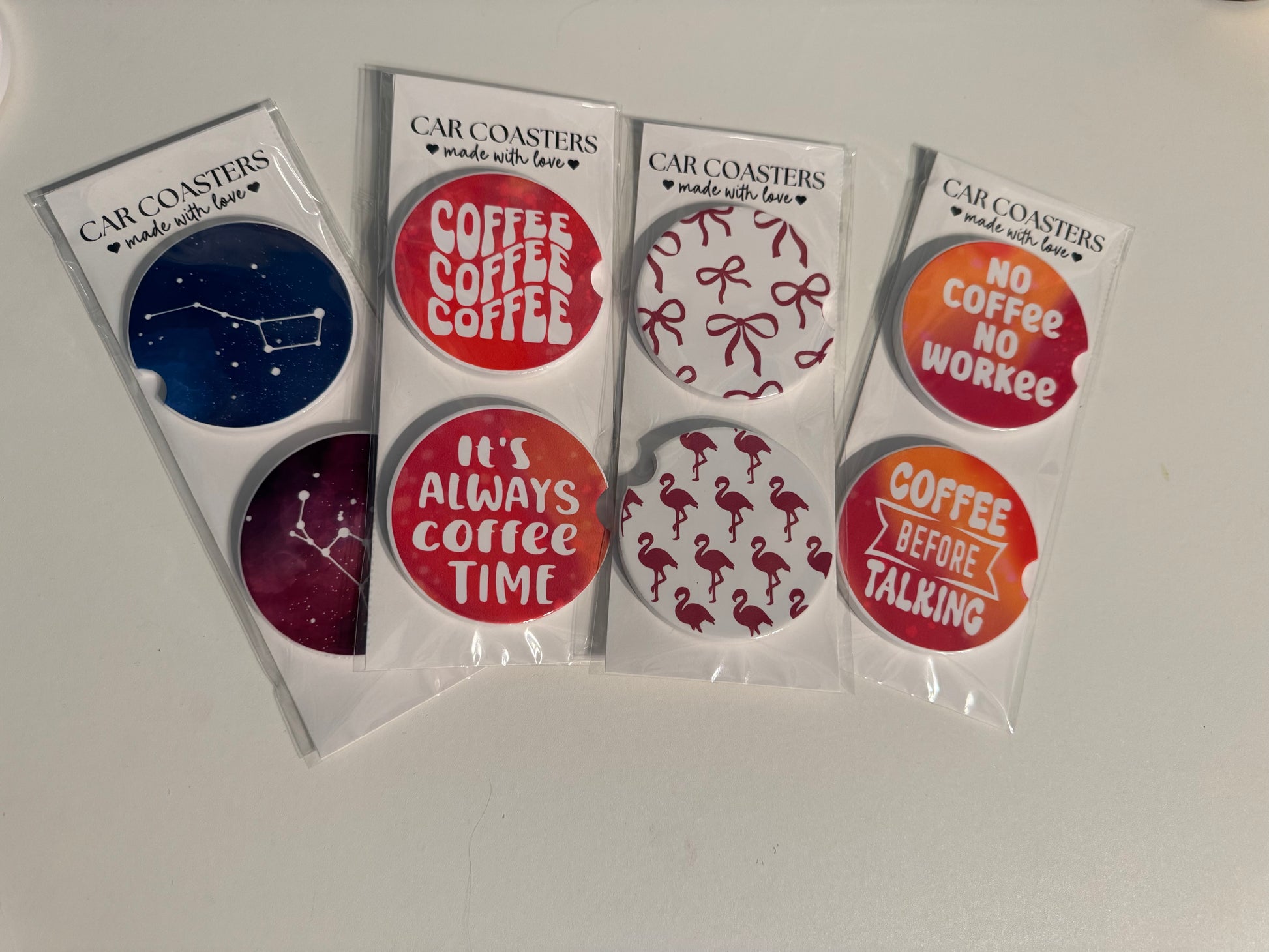 Add some style to your car with this listing for a set of 2 ceramic car coasters— There are Neoprene options in another listing. There is currently 1 set of each in stock ready to ship but once they are sold, each one will be unique as they will be made to order. Perfect for gifting to someone special in your life or keeping for yourself. Will be adding other designs soon. The material used for the coffee and constellation bundles is unique with each print.