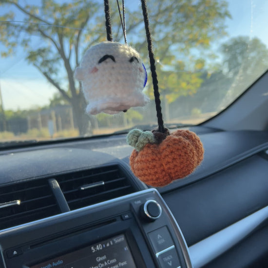 Featuring a little ghost and pumpkin connected with a black yarn cord, these buddies will hang freely from your mirror while you drive. Catch the attention of nearby drivers who will becomes jealous of your little buddies!